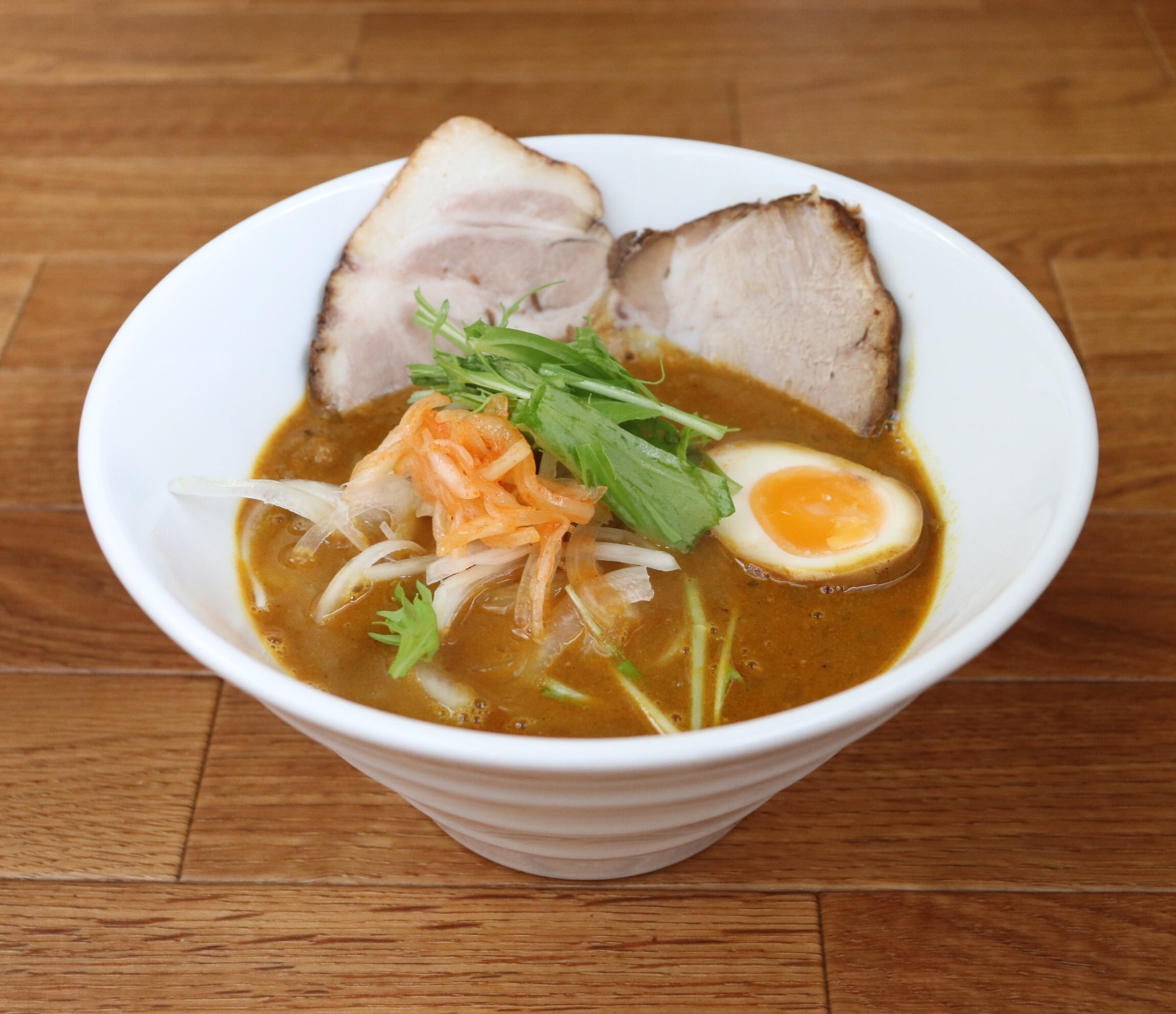 ◉一口食べれば、辛さと旨味が広がります。じっくりと炒めた玉ねぎに特製のスパイスとコクのあるスープが絶妙なバランスで調和しており、辛さと旨味の相乗効果が味わえます。麺は国産小麦を使用、「富士山の伏流水」で練り上げた多加え水麺。もちもちとした食感で、スープとの相性も抜群です。また、化学調味料、保存料は使用せず、安心して食べていただけるように仕上げました。