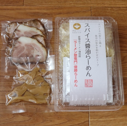 伊豆の自然豊かな里山で山葵の栽培とスパイスを使った料理を提供している伊豆あまからや。新横浜ラーメン博物館主催の「ラーメン登竜門」にて優勝した「スパイス醬油らーめん」は、ブレンドスパイスの香りと鶏&魚介の旨みを利かせたスープ。麺は国産小麦「夢ちから」を使用し、名水「富士山の伏流水」で練り上げた多加水麺です。しっかりとしたコシの中にもしなやかな弾力、小麦の味わい広がる麺に仕上げてあります。